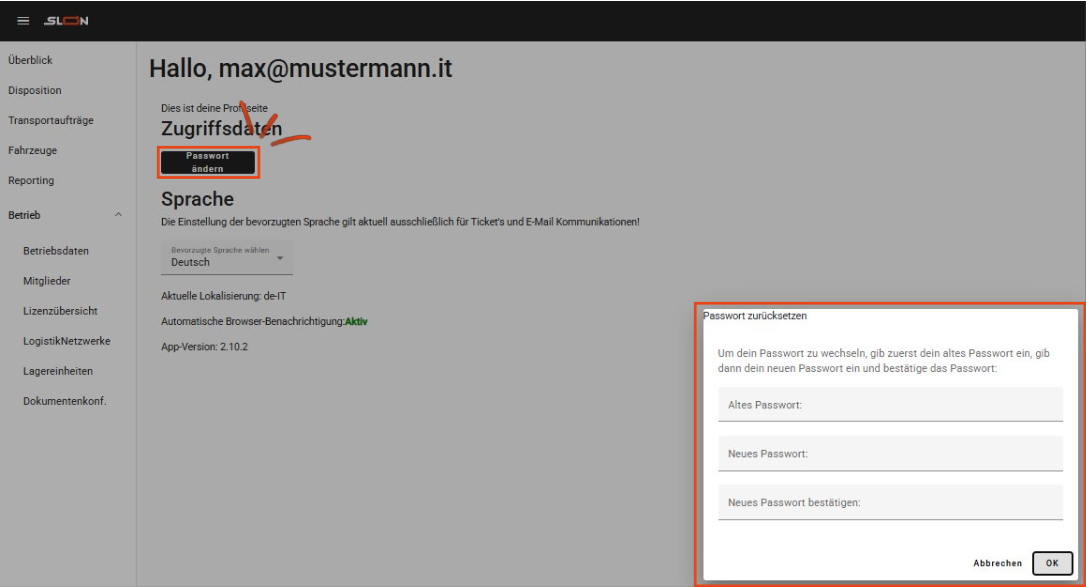 Betriebsdaten → Profil → Passwort ändern