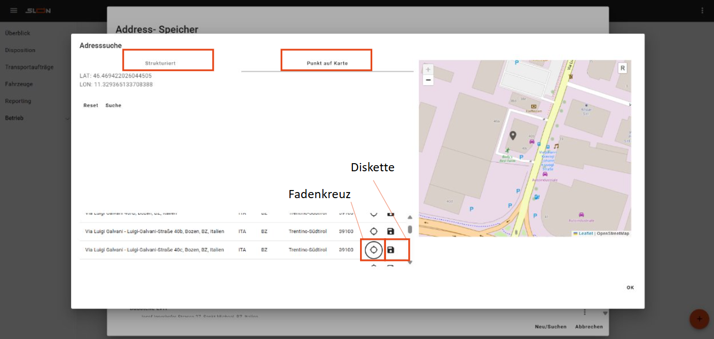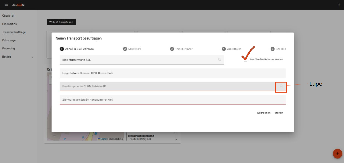 - Adresse manuell wählen: Über das Lupen-Symbol öffnen Sie den Adressspeicher und können eine bereits hinterlegte Adresse auswählen. Neue Adressen, die Sie eingeben, werden automatisch gespeichert und stehen für zukünftige Transportaufträge zur Verfügung.