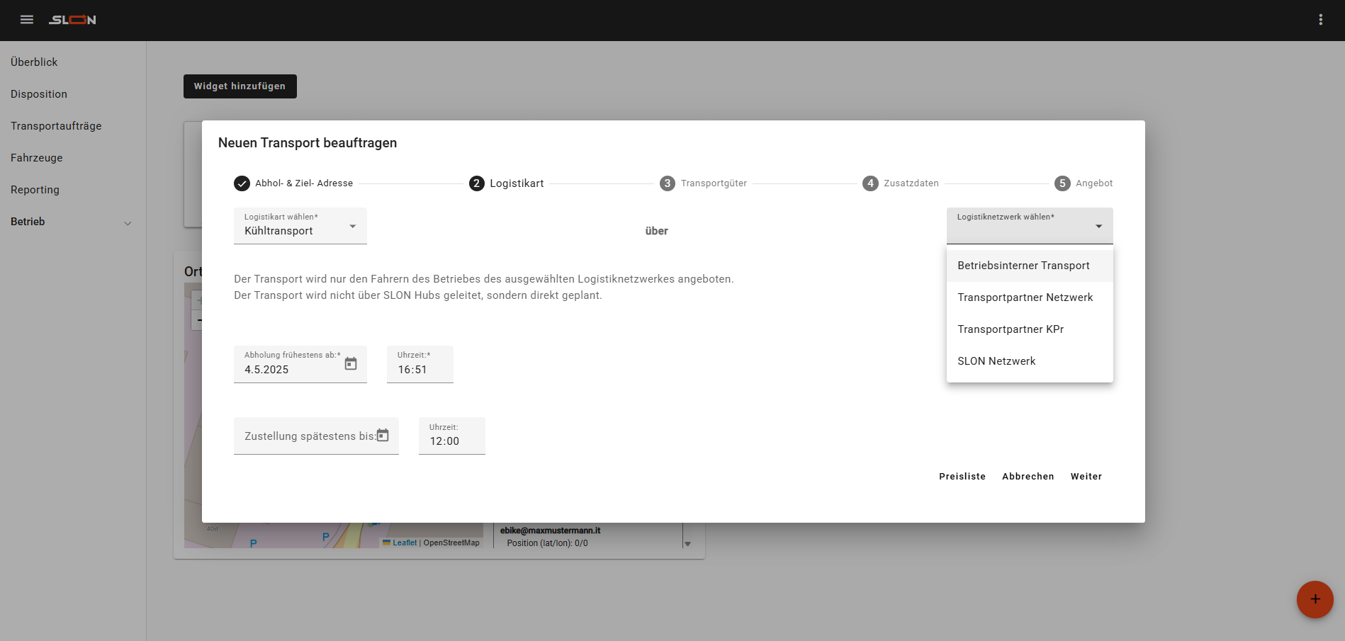 - SLON-Netzwerk: Eingabe ins offene Netzwerk – Aufträge können von anderen Transportunternehmen eingesehen und übernommen werden.