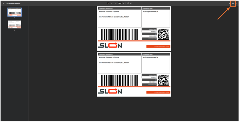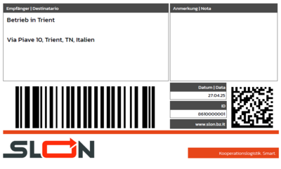Eine jede zu versendende Transporteinheit muss vor dem Transport mit einer Barcode-Etikette ausgezeichnet werden. Diese Barcodeetikette wird entweder durch ein kundenseitig bestehendes System (z.B. ERP System) oder direkt durch die SLON Plattform erstellt:
